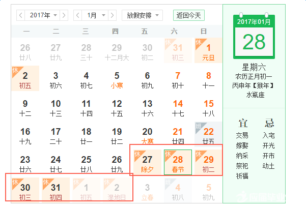 2017年春节放假安排为:1月22日(星期日)、2月4日(星期六)日照常上班。